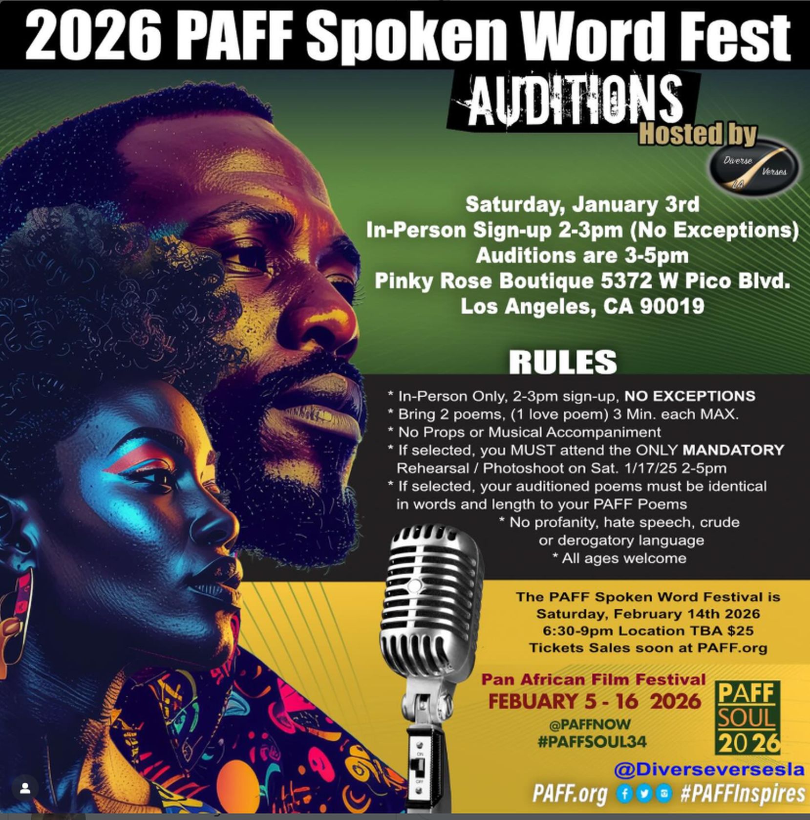 Calling all Poets and Spoken Word Artists! Now is your chance to audition for the 2026 Pan African Film Festival Spoken Word Fest! All info. Is in the flyer above.⬆️ See you then!