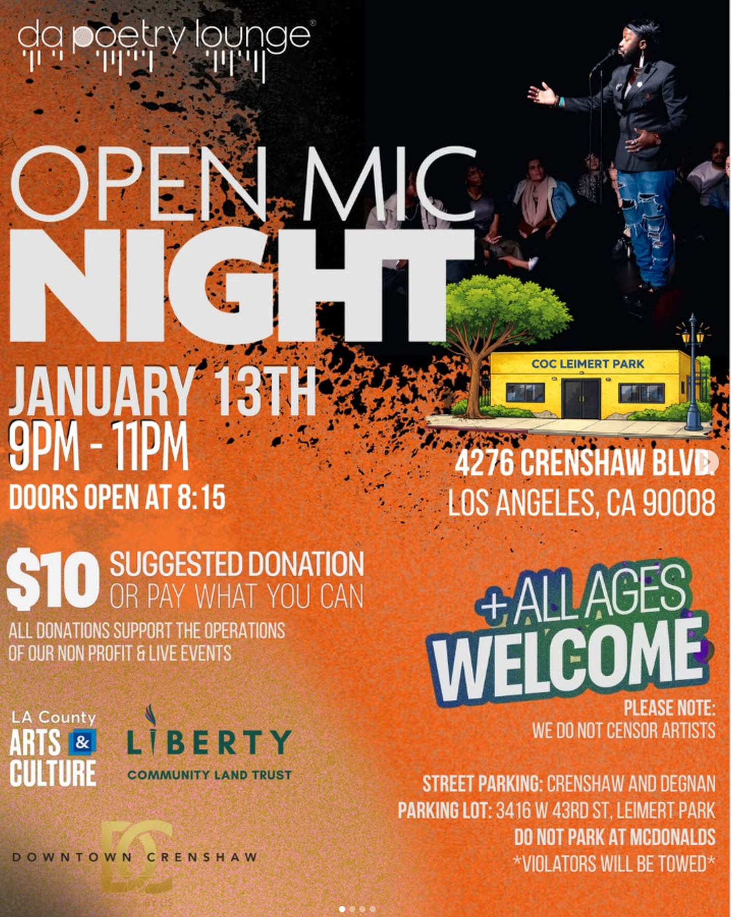 TOMORROW NIGHT!!!! Y’all bring the poems, we’ll bring the vibes. Tell a friend, bring a friend! See you there! Doors open at 8:15 - show starts promptly at 9pm! COC - COMMUNITY OWNED CENTER ADDRESS: 4276 Crenshaw Blvd. Leimert Park, Los Angeles, CA 90008 PARKING: Street parking: Crenshaw and Degnan Parking Lot: 3416 W 43rd St Leimert Park, Los Angeles, CA 90008 PLEASE DO NOT PARK AT THE MCDONALDS *you will be towed*