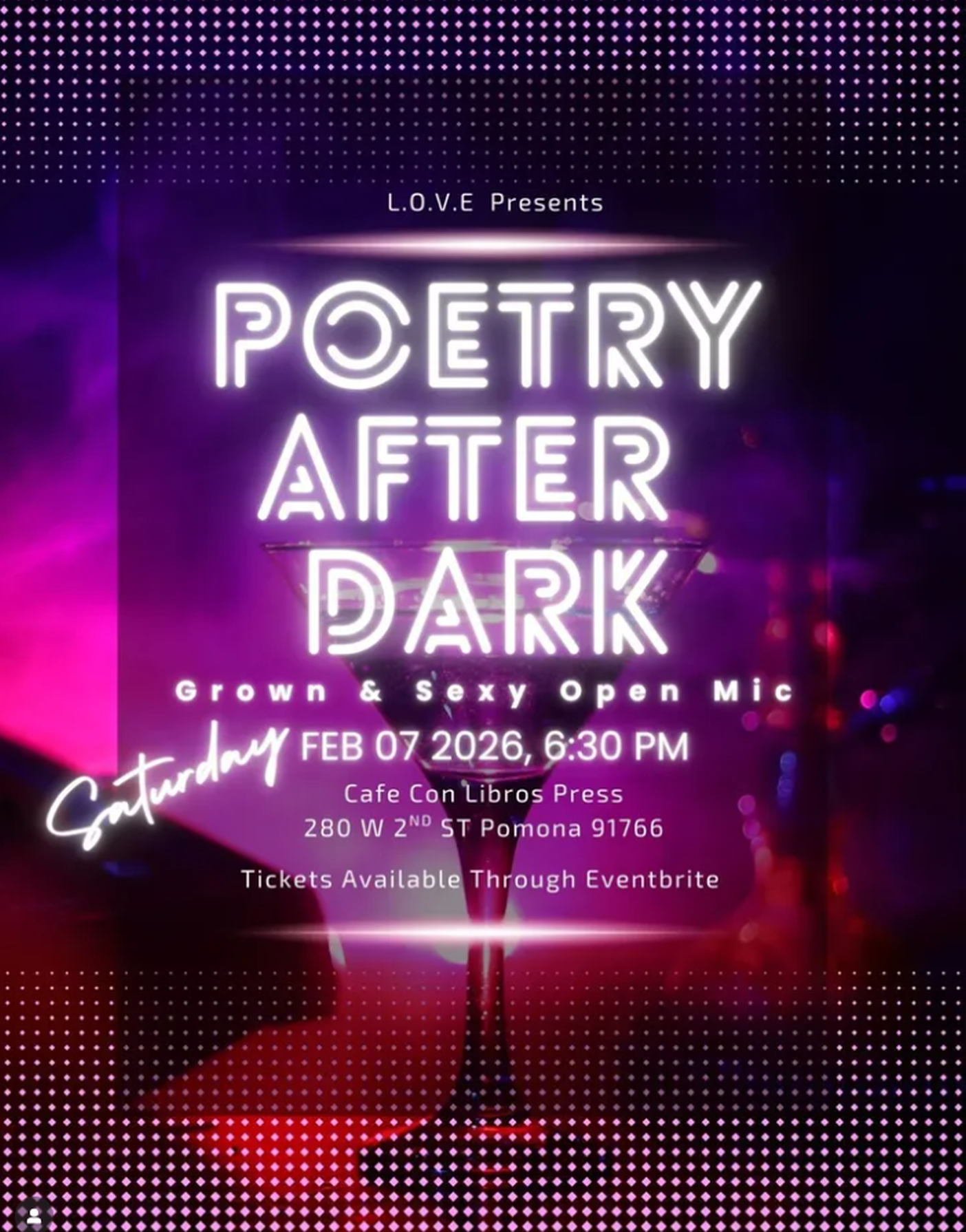 Who is ready for the 6th annual Poetry After Dark: Grown and Sexy Open Mic? We are returning to Cafe Con Libros Press in downtown Pomona Saturday February 7th. If you think you can handle all the steaming, spicy, sexy, sensual, poetic vibes, get your tickets now. Link in my bio.