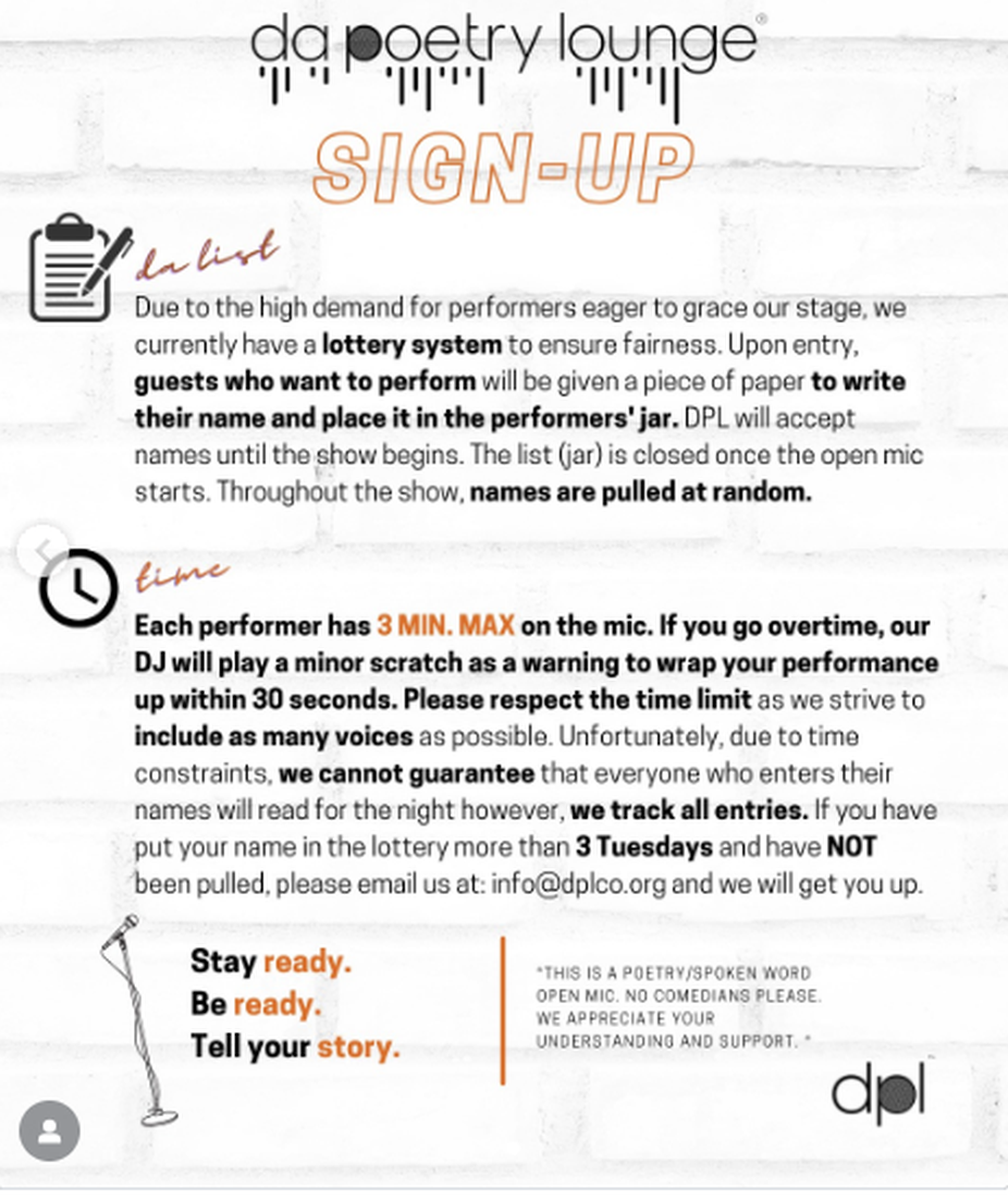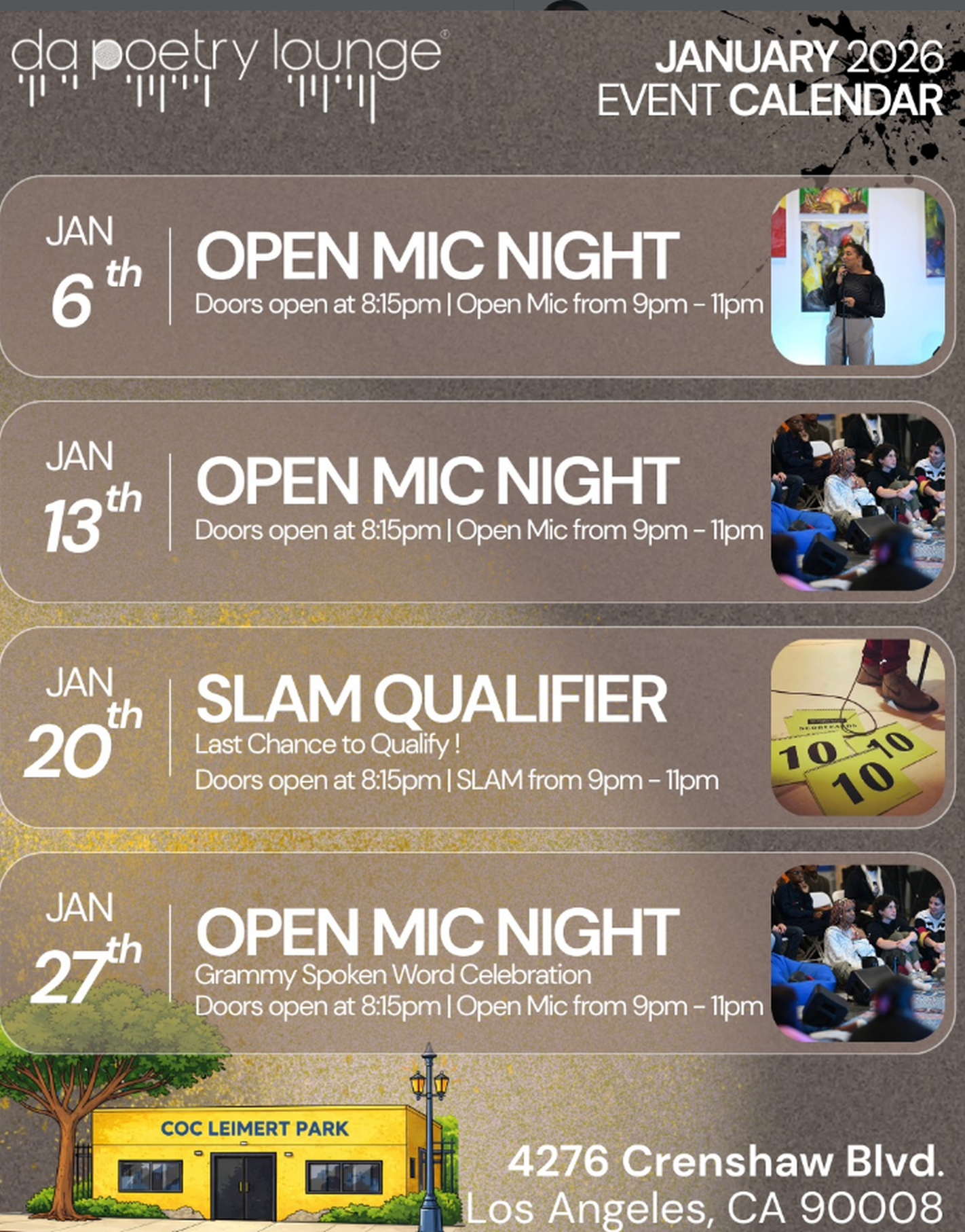 January at DPL - Catch us in Leimert Park 🔥 Pull up, and bring the vibes! Don’t miss the magic! 🗓️ January Events: * Jan 6th – Open Mic - DPL Returns 🎤 * Jan 13th– Open Mic 🎤 * Jan 20th – LAST Chance SLAM💥 * Jan 27th– Open Mic - Grammy Spoken Word Celebration🎤 2dill be towed*