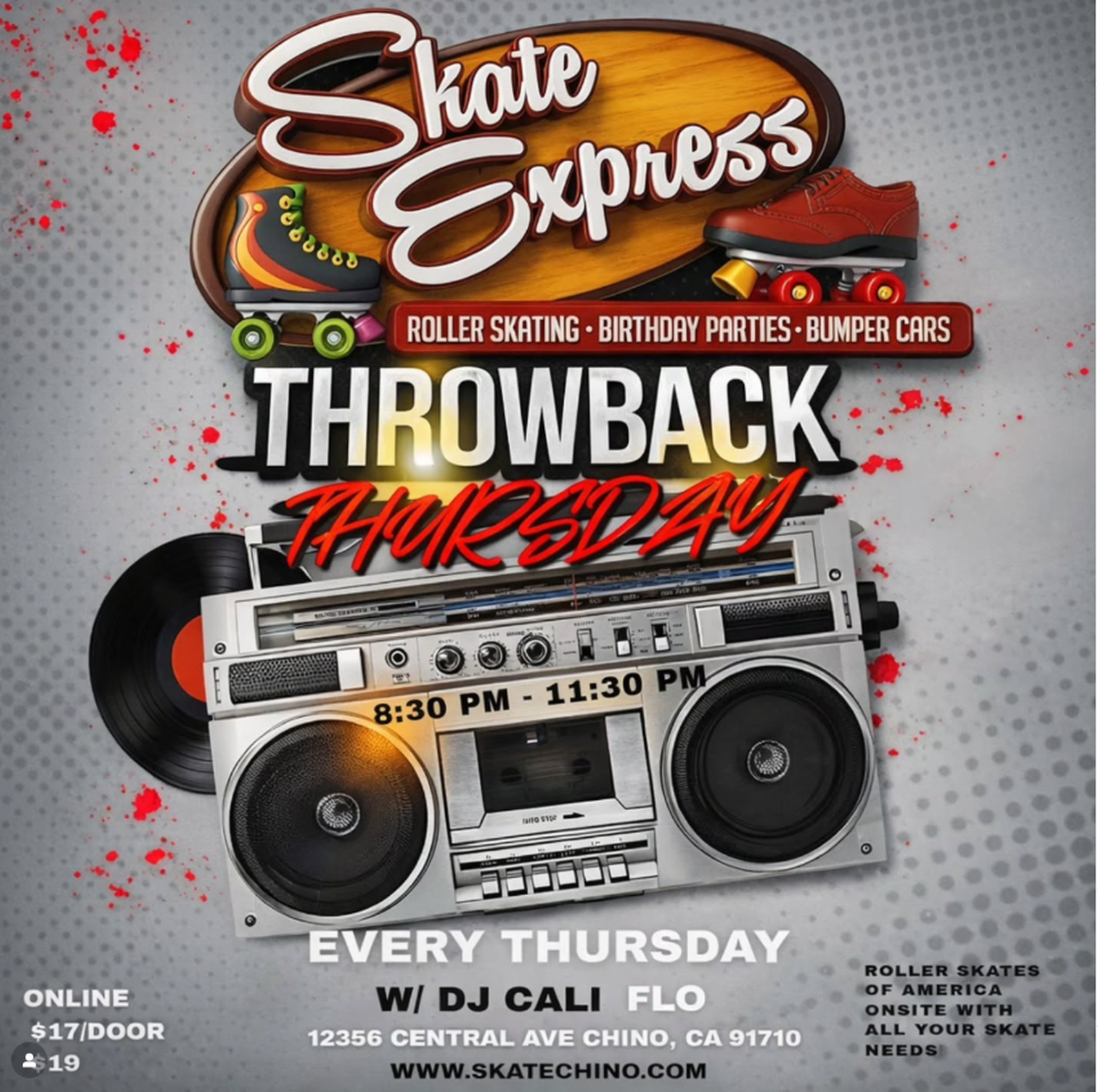 Hey Skate Express family! 🙌 It’s Thursday, and you know what that means… SKATE NIGHT! 🛼✨ Pull up TONIGHT at Skate Express from 8:30PM–11:30PM with 🎧 DJ Cali Flo bringing the vibes all night long! Plus, Roller Skates of America will be on-site with all your skate needs 🛍️👟 🎟️ Grab your tickets now at www.skatechino.com Let’s roll! 💃🕺 🧠 FREE tutoring during the first hour — session opens early, so come ready! Roll in, study smart, then skate it out 💥 🎟 Get your tickets now: www.skatechino.com #SavedByTheBell #HomeworkOnWheels #SkateChino #WednesdayVibes #StudyThenSkate #FamilyFun #RollWithUs 🛼📚